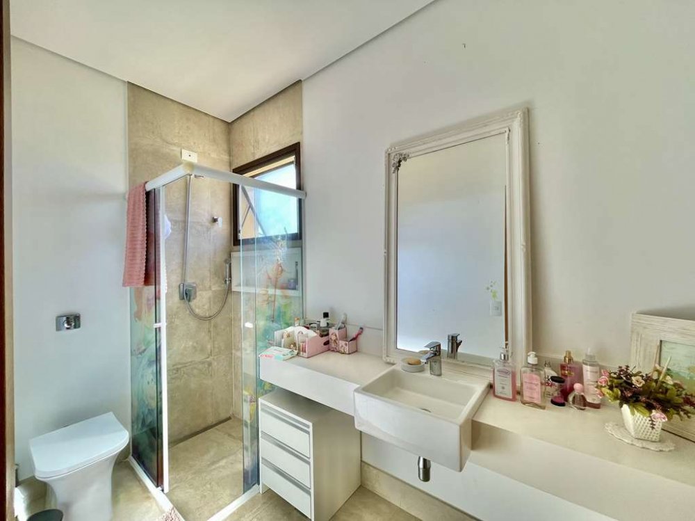 - Banheiros com bancadas, box de vidro e nichos. Sendo a master uma sala de banho envidraçada "panorâmica" com teto de vidro, 2 Cubas, 2 vasos, 2 chuveiros e preparada para instalação de sauna úmida, hidro, TV e áudio.
