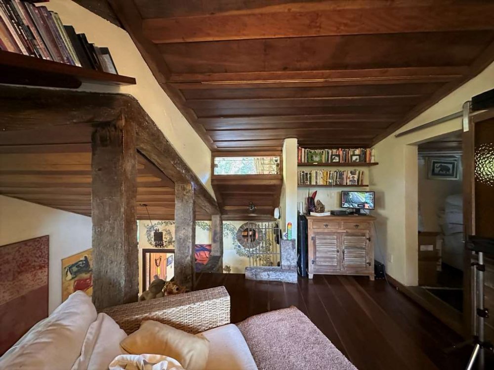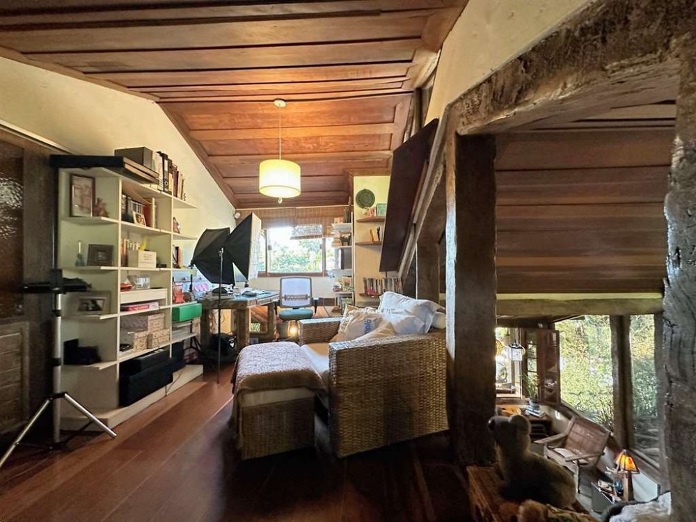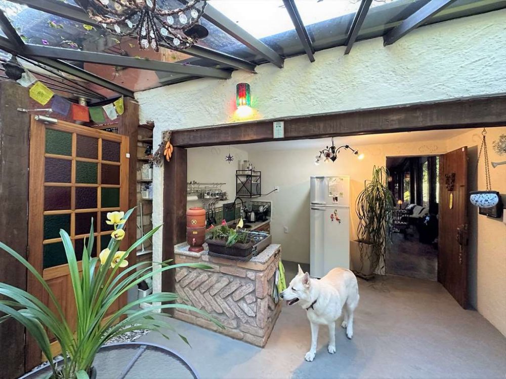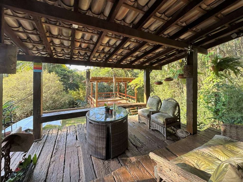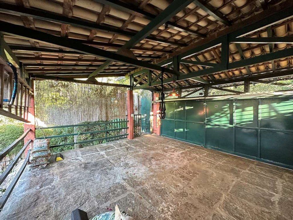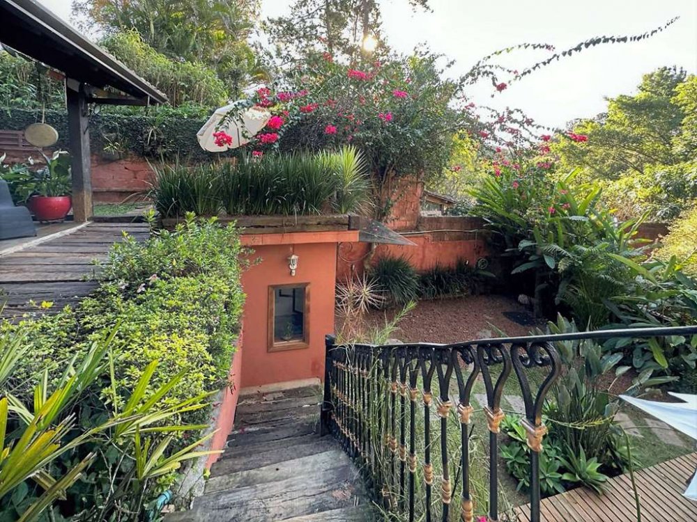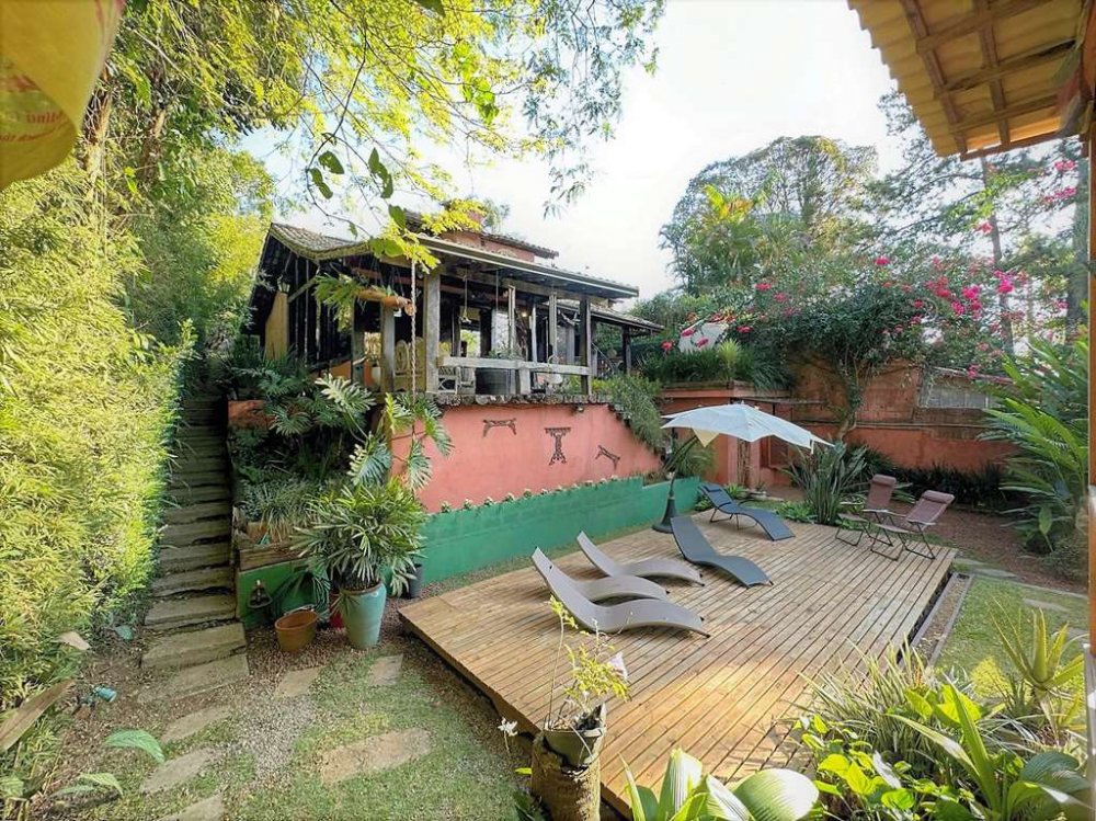 • Piscina de alvenaria 8m x 4m, revestida em ladrilho hidráulico, desativada e fechada por um grande deck solarium de madeira, voltado para a natureza.