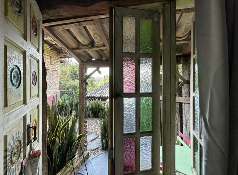 • Portas e janelas em madeira de demolição, sendo algumas em pinho de Riga e vidro.