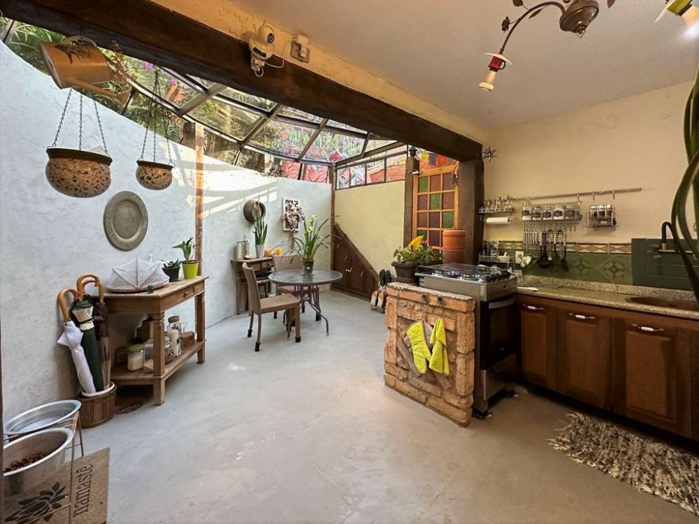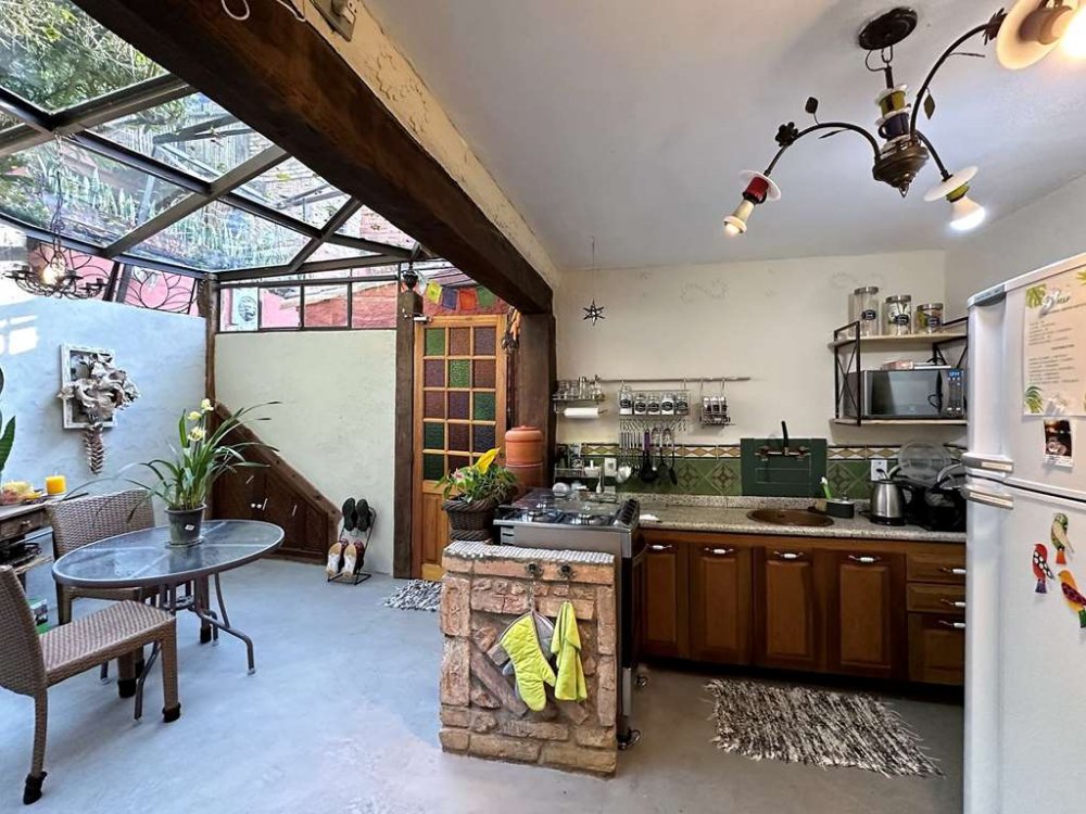 • Cozinha com sala de almoço, cobertura envidraçada, detalhes em azulejo hidráulico, bancada em granito e gabinetes de madeira.