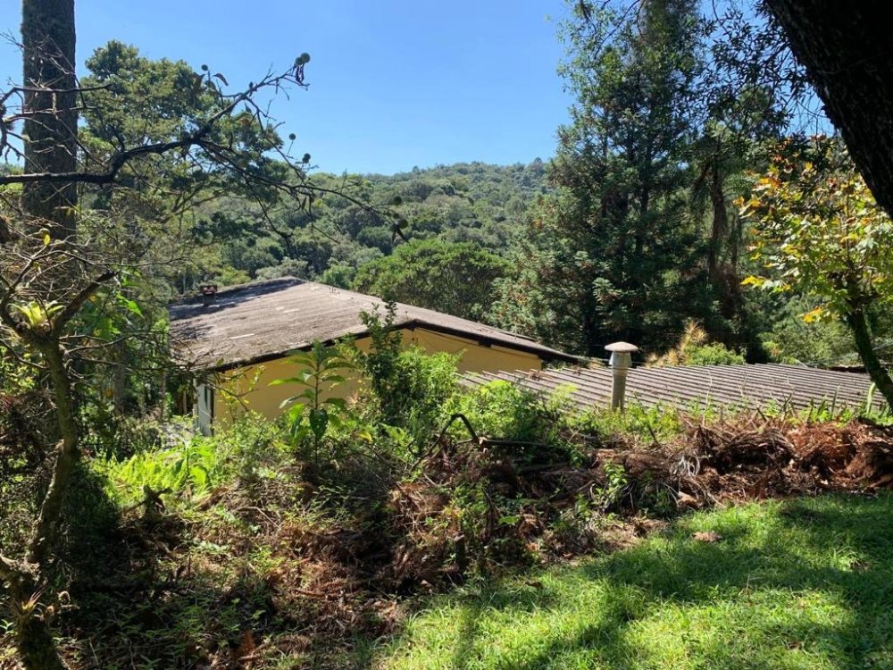 • Cerca de 250 metros quadrados, com sala para 4 ambientes, lareira, teto alto com forro em lambris e tesouras estruturais em madeira nobre aparentes, com portas balcão para acesso para a ampla varanda em L, com belíssima vista para a mata, copa-cozinha com armários e prateleiras, um banheiro social completo, três dormitórios amplos, sendo uma suíte.