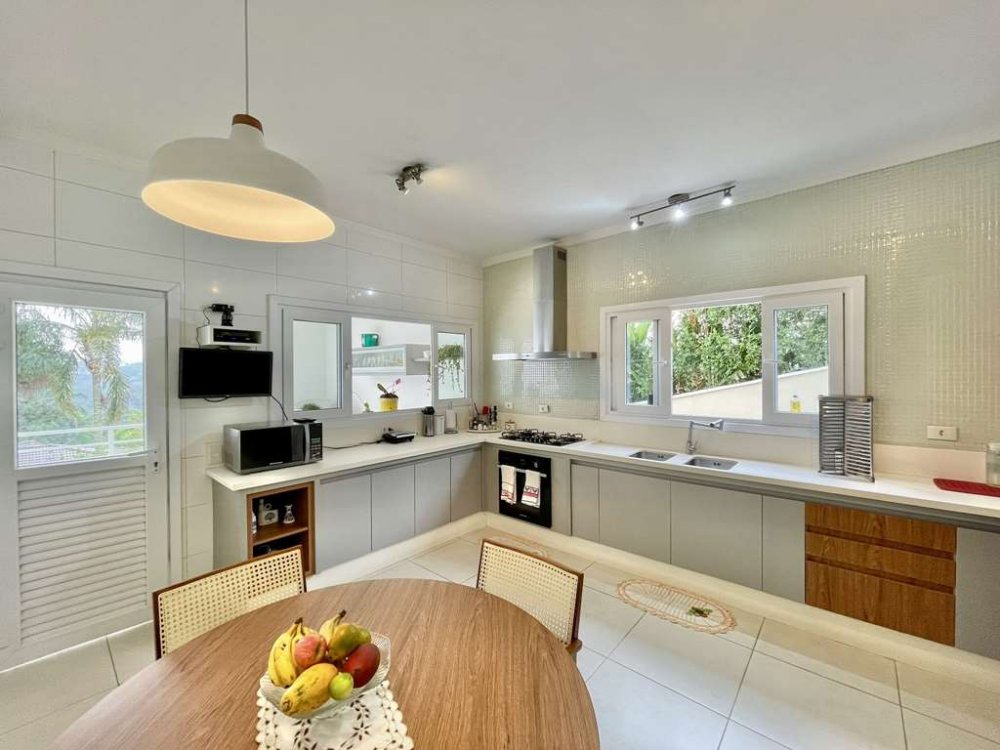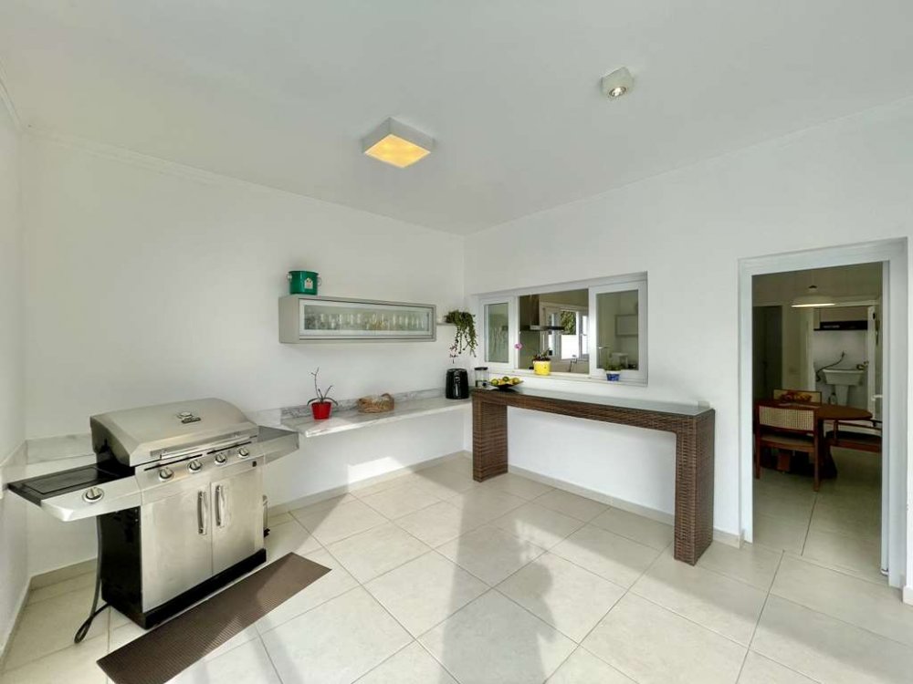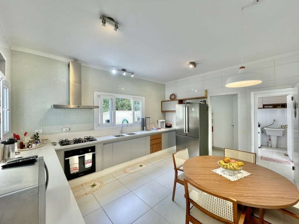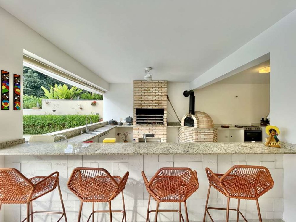 • Grande bancada de granito em "U", balcão para 4 acentos, 3 cubas inox, churrasqueira, forno de pizza, aparadores e gabinetes.