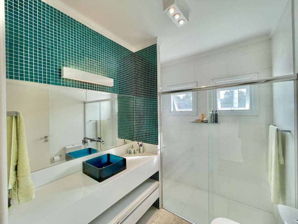 • Banheiros com tampos em silestone, espelho, gabinete e box de vidro. Sendo a máster com 2 cubas e hidro.