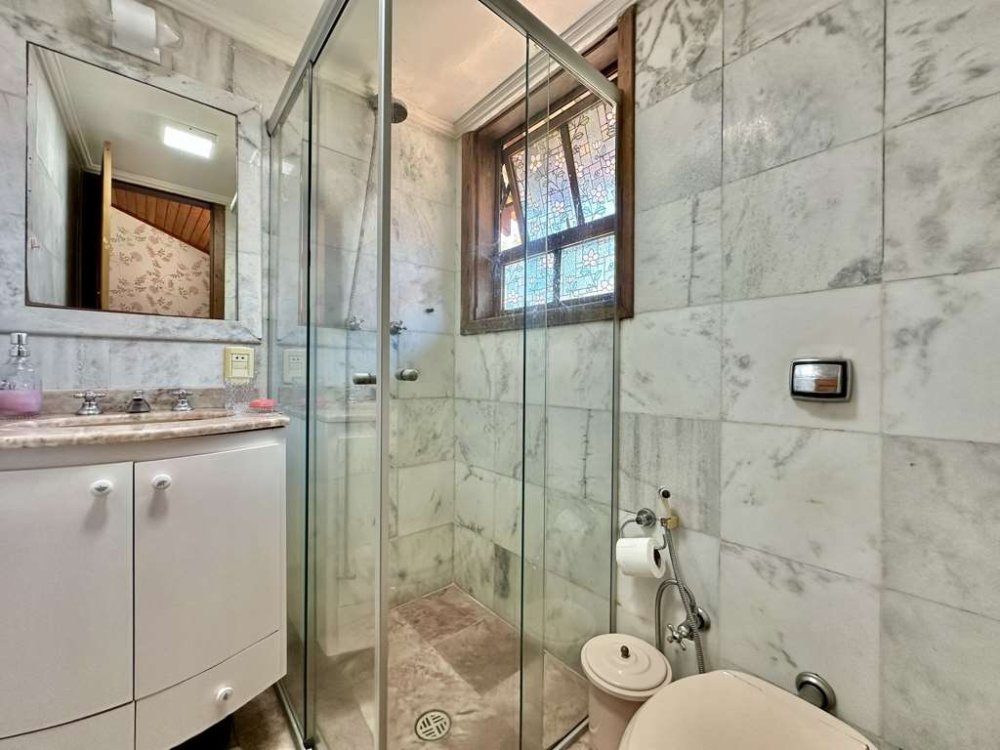 • Banheiros com tampos em mármore, espelhos, gabinetes e box de vidro, sendo a master com 2 cubas, hidro com bay window e vitrais.