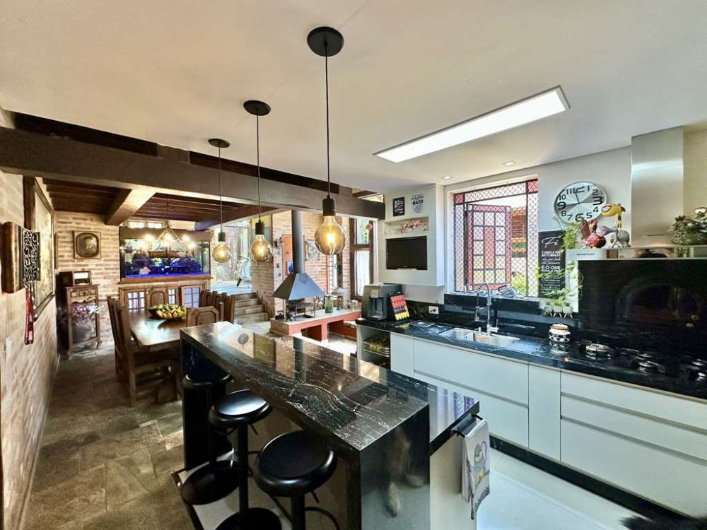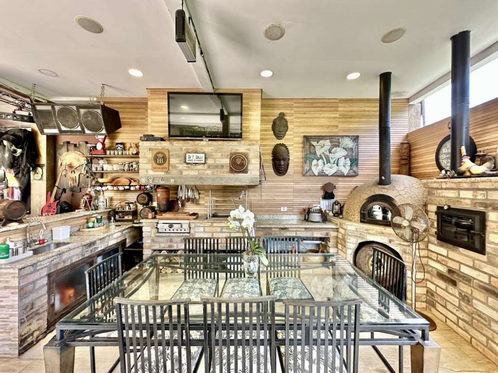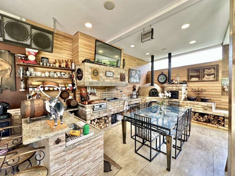 • Totalmente equipado com bar, churrasqueira, forno de pizza, forno e fogão à lenha com tampos em granito, cuba inox, torneira gourmet e gabinetes.