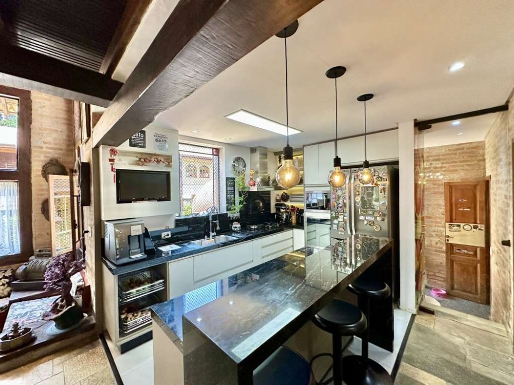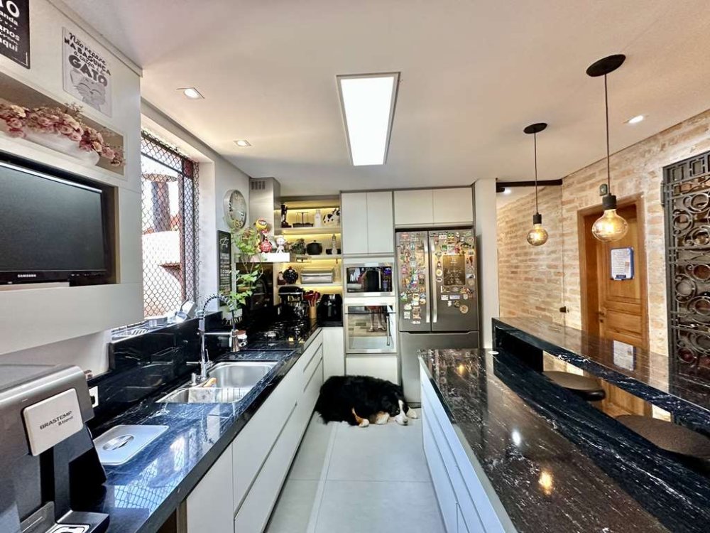 • Cozinha planejada repleta de armários com despensa, bancadas em granito, 2 pias inox, ilha com balcão, coifa inox e fogão 5 bocas Brastemp.
