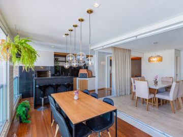 Apartamento, em andar alto de 194 metros, living em 2 ambientes: estar e jantar, lavabo, varanda gourmet com churrasqueira e forno de pizza fechada com vidro, sala de tv, 3 suítes , incluindo suíte master com closet, ofurô e 02 chuveiros, todas as suítes com ar condicionado split, cozinha planejada e espaço para copa, área de serviço com banheiro, 4 vagas na garagem fixas.