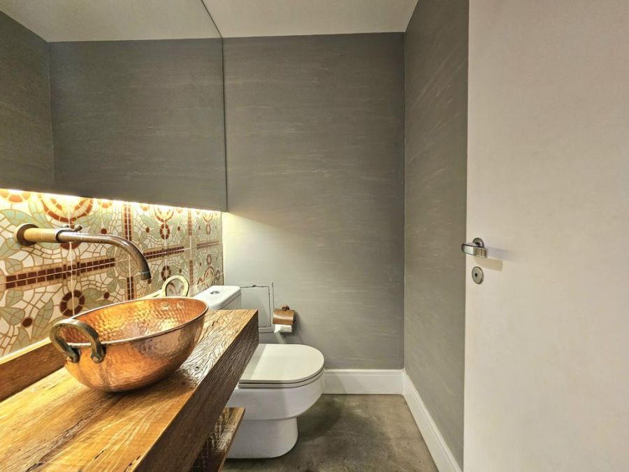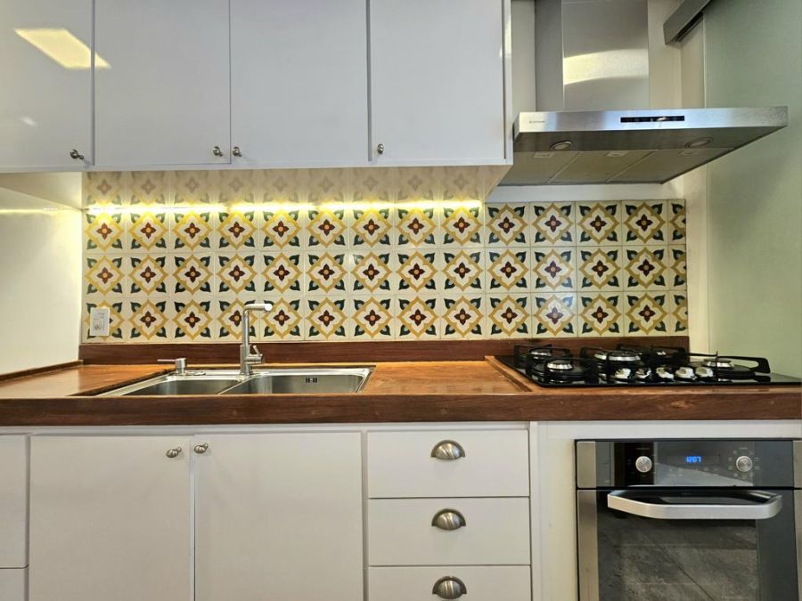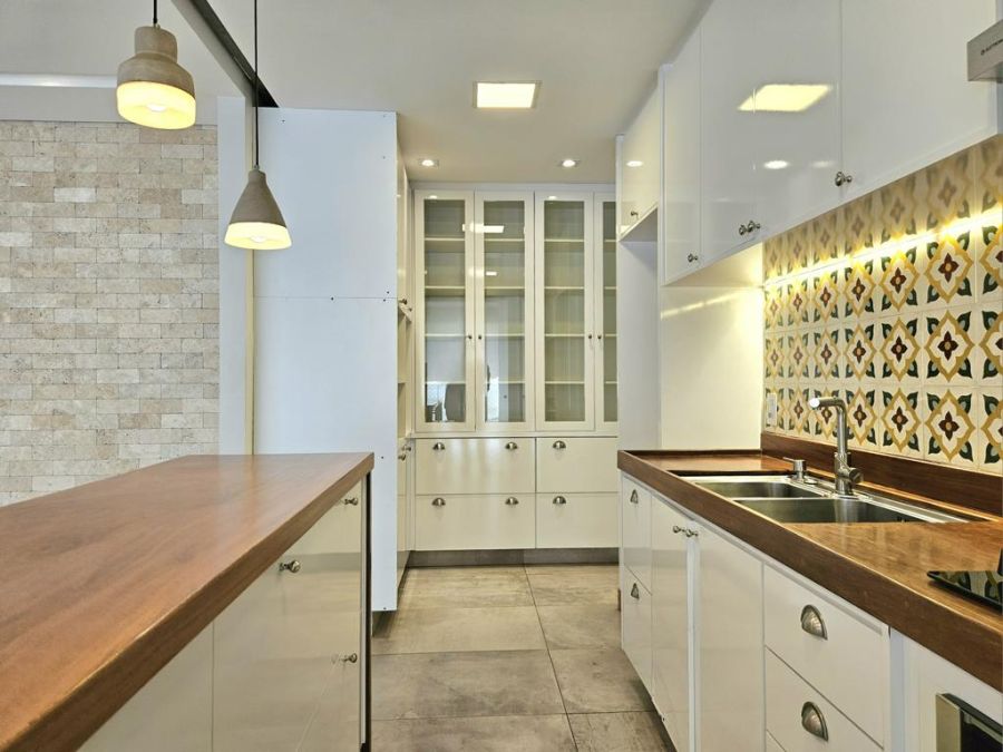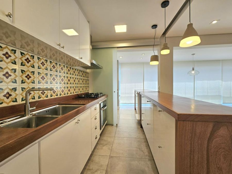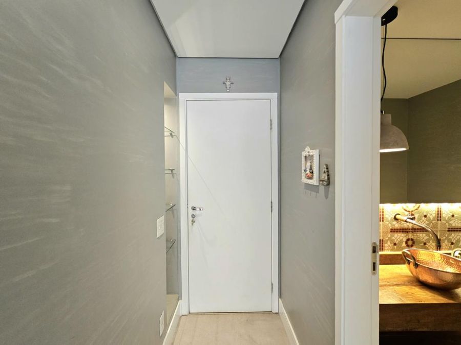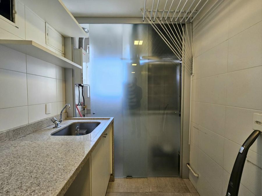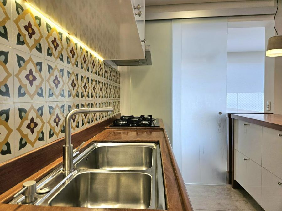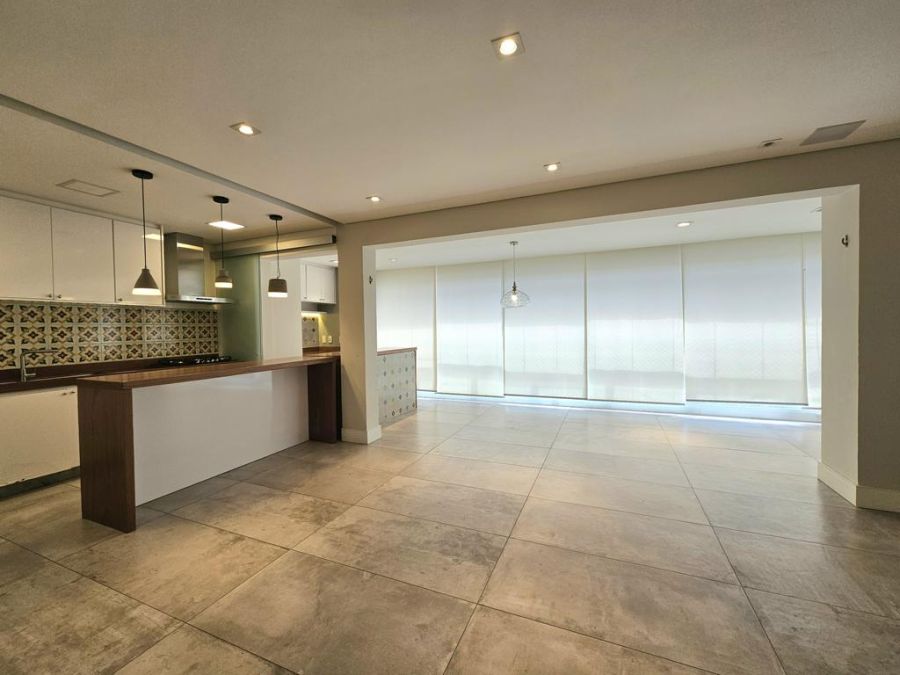A cozinha atualmente é aberta para a sala, porém possui infraestrutura pronta para instalação de porta de correr, permitindo isolar os ambientes quando desejado.