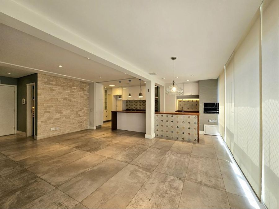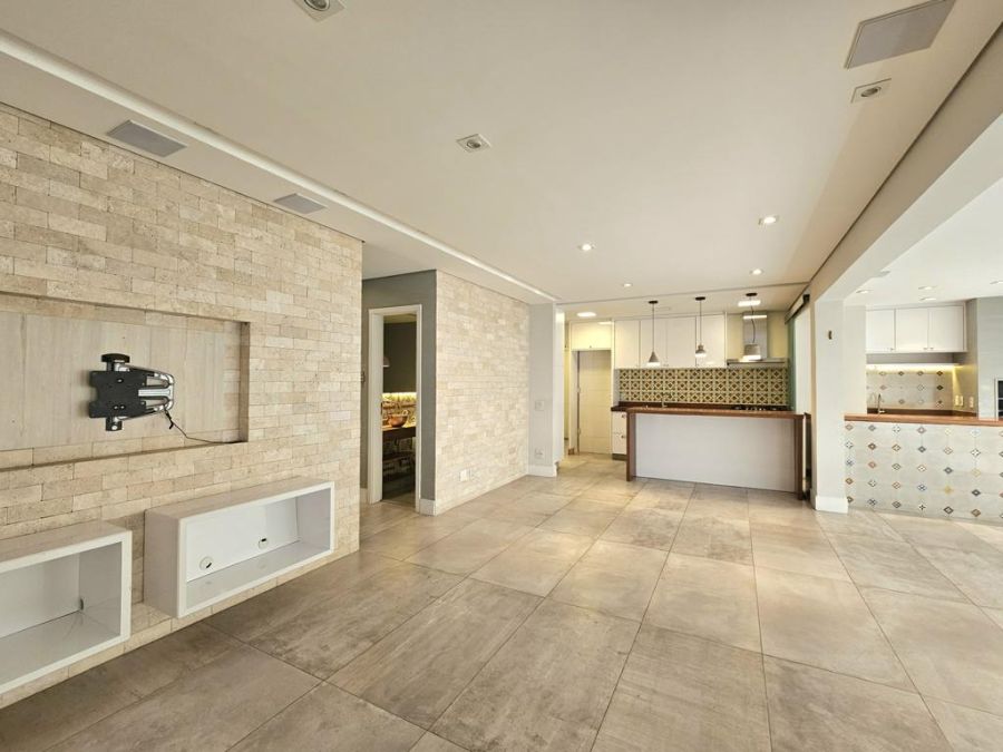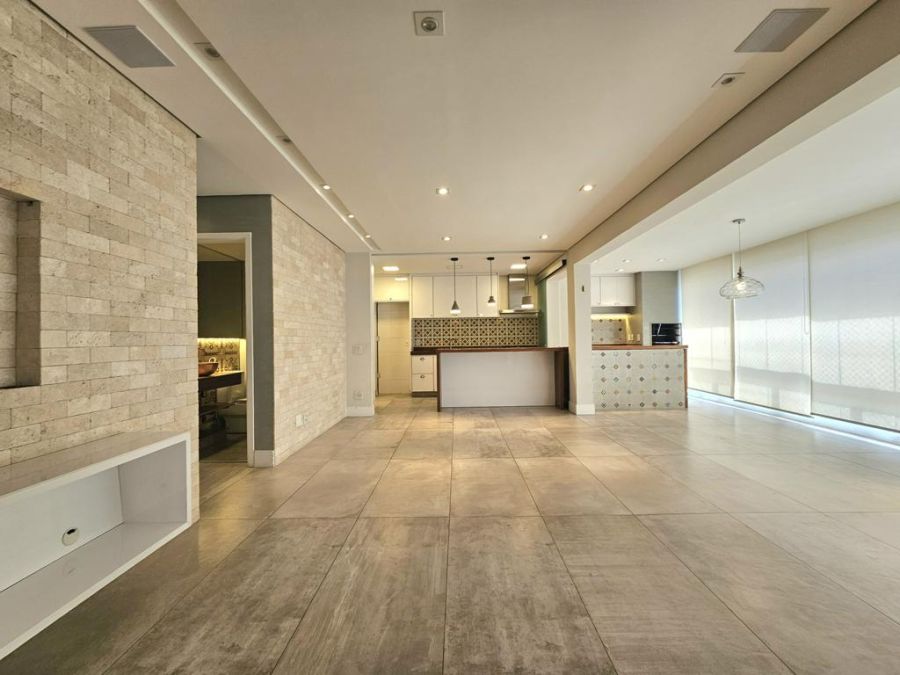 A varanda gourmet é integrada à sala e à cozinha, criando um ambiente amplo e agradável.