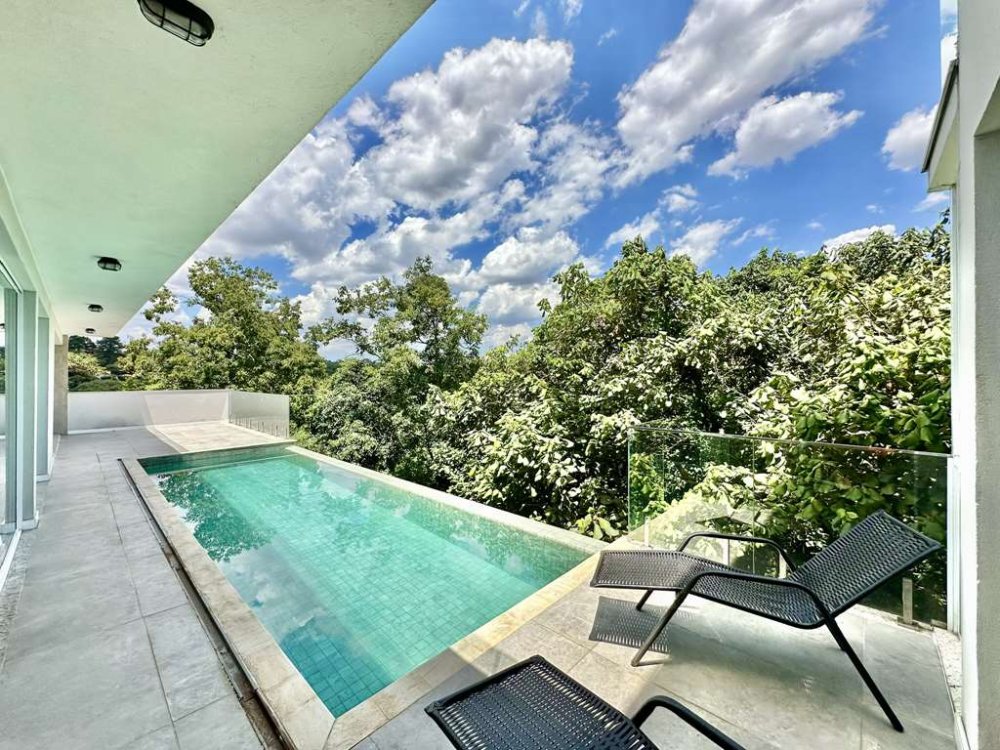 - Piscina elevada sobre pilotis (8,00 m de altura) com borda infinita, ducha, solário e vista para um bosque particular. Com infraestrutura preparada para aquecimento (solar), revestida em pastilhas cerâmica tipo pedra Hijau e iluminação com controle de cores.
