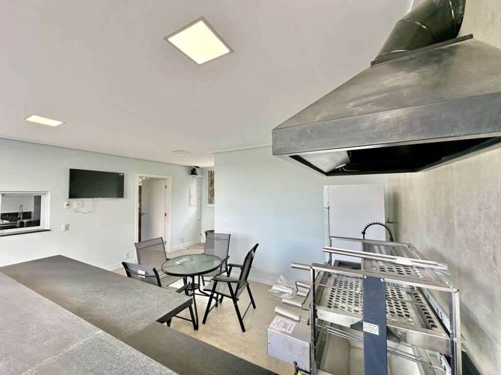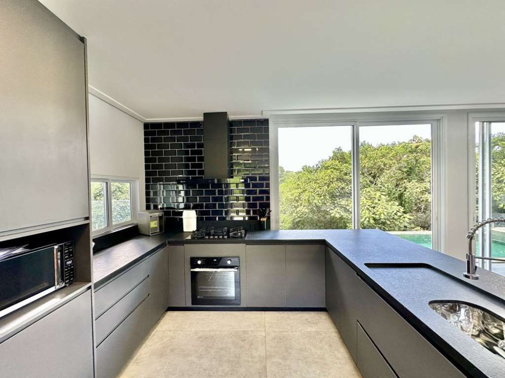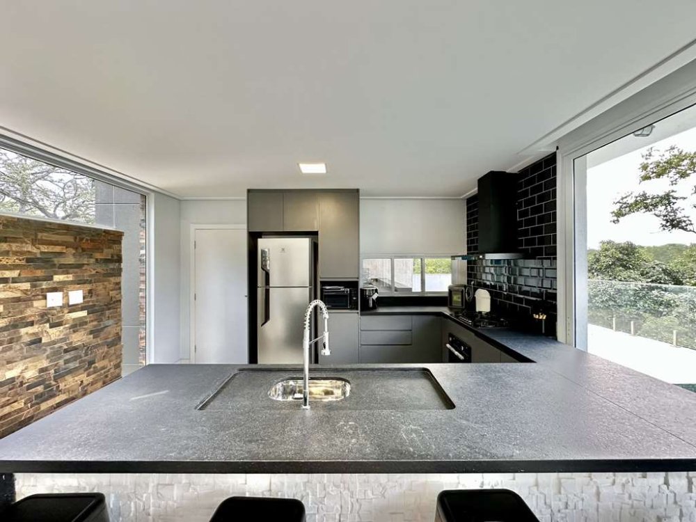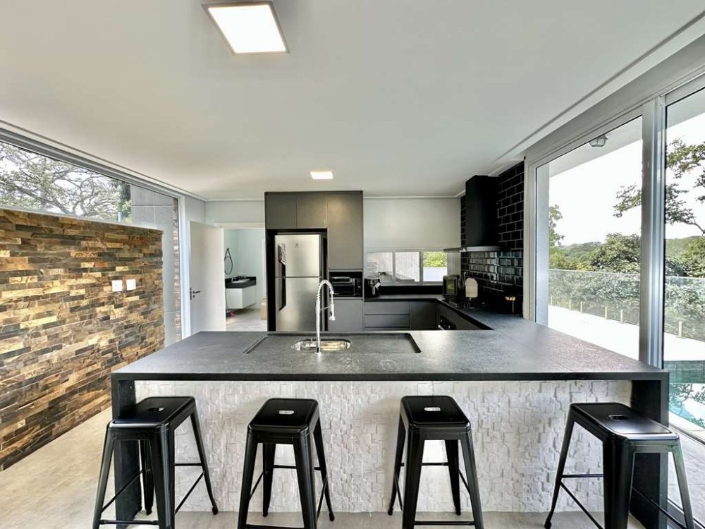 - Cozinha integrada com espaço gourmet em varanda junto à piscina, com bancadas pia e balcões.