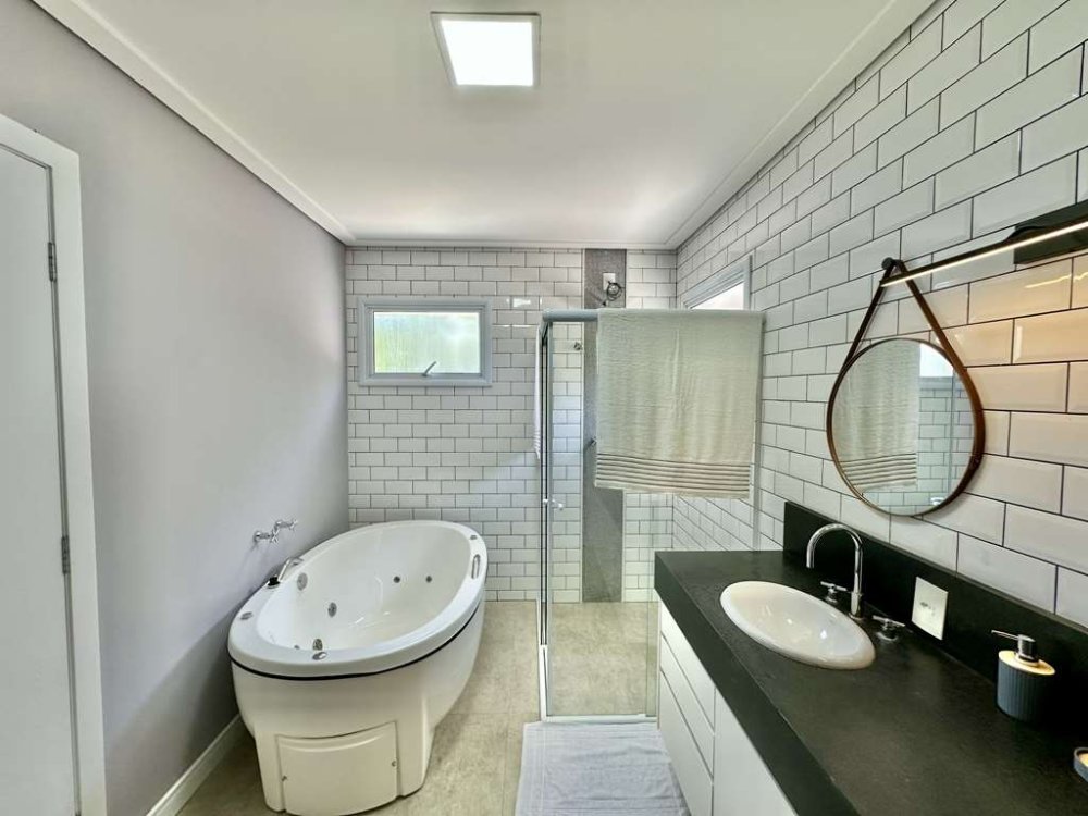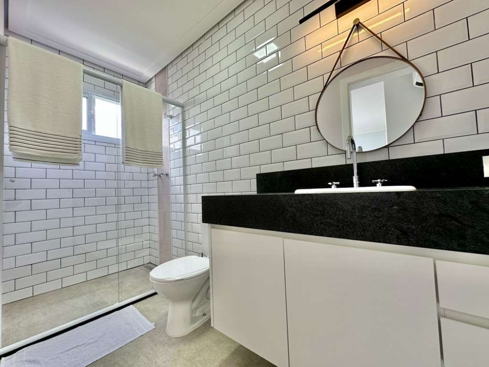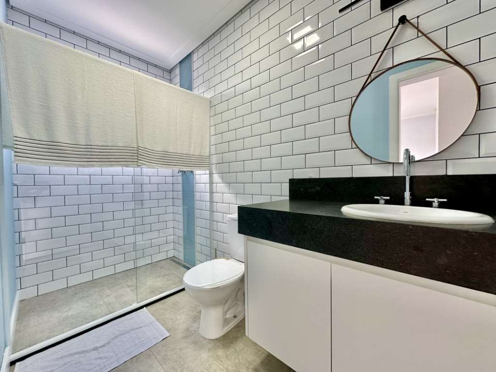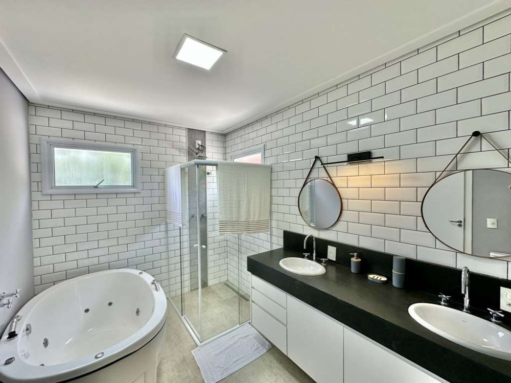 - Banheiros com bancadas, pia e box de vidro, sendo a máster com 2 cubas e hidro.